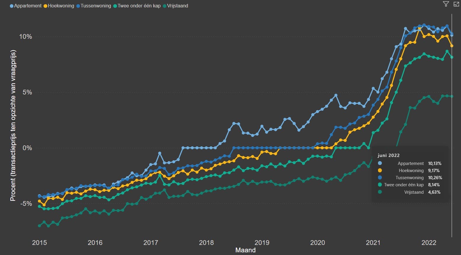 De kentering is wel zichtbaar in het aantal keer dat werd overboden op de vraagprijs. De onderstaande grafiek laat zien dat er voor alle woningtypen in juni minder overbiedingen waren.