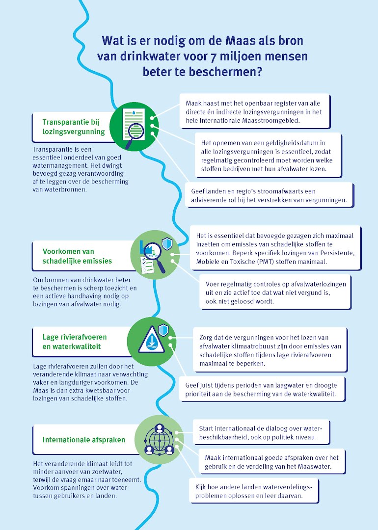 Volgens RIWA moet er voor het hele Maasstroomgebied snel inzicht komen in welke stoffen bedrijven met hun afvalwater lozen. Essentieel daarbij is het opnemen van een einddatum in alle lozingsvergunningen. Zodat bij herziening gecontroleerd wordt welke stoffen daadwerkelijk geloosd worden en of de lozing niet schadelijk is bij lage rivierafvoeren. Vooral van bedrijven die afvalstoffen via de riolering lozen is in Nederland weinig tot niets bekend. In Vlaanderen is deze informatie veelal wél beschikbaar. Van der Ploeg: “RIWA roept Nederlandse gemeenten en provincies op hun zorgplicht serieus te nemen en deze transparantie te verschaffen. Het is essentieel dat bevoegde gezagen zich maximaal inzetten om emissies van schadelijke stoffen te voorkomen. Zonder deze inzet is een effectieve bescherming van de Maas als bron van drinkwater voor 7 miljoen mensen onmogelijk.”