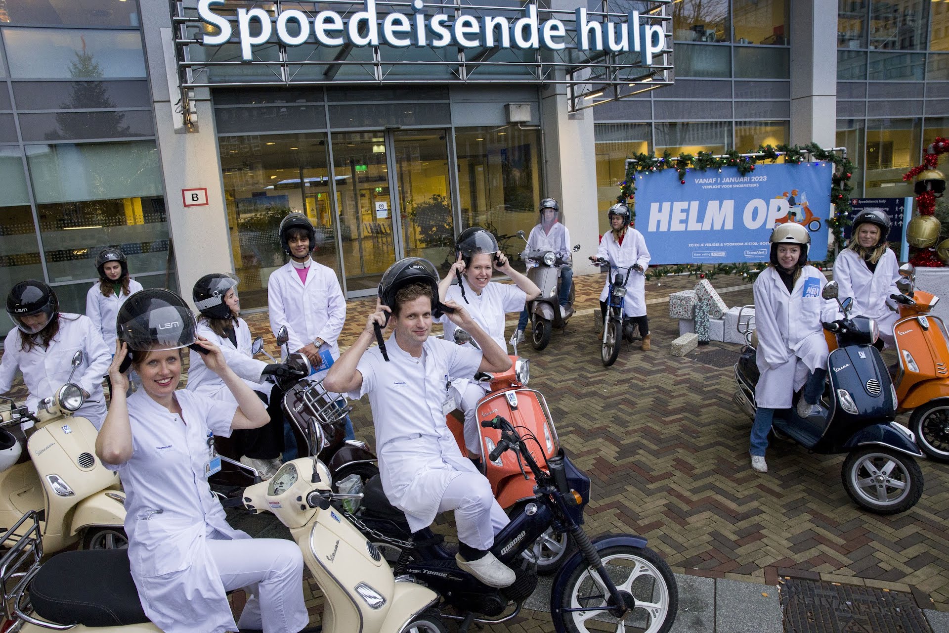 DEN HAAG, 5 december 2022 – Voorlichters van TeamAlert reizen in de maand december verkleed als artsen per snorfiets langs meerdere steden in Nederland om snorfietsers attent te maken op de naderende helmplicht, die per 1 januari 2023 ingaat. Uit onderzoek blijkt dat de kans op dodelijk hoofdletsel in het verkeer met 71 procent afneemt als ze een helm dragen. De actie start vandaag bij het Erasmus MC in Rotterdam, waar TeamAlert wordt vergezeld door een team van echte artsen.